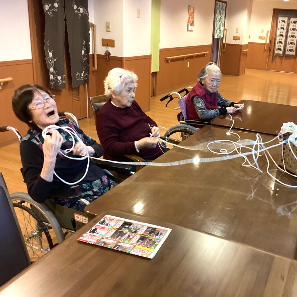 お正月に宝引きをしました。健康や幸運、世界の平和?・・・あらゆるものをたぐり寄せたいですっ!!(実際のところはドーナツやクッキーでした)
