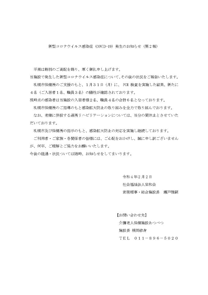 2022.02.02 老人保健施設 あつべつ コロナウイルス感染について お知らせ 栄和会 本部 社会福祉法人栄和会法人本部より大切なお知らせを発信いたします。 コロナウイルス感染について お知らせ 前の記事 やすらぎダンス♪ 次の記事