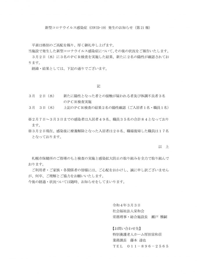 2022.03.03 特別養護老人ホーム 厚別栄和荘 新型コロナウイルス感染について お知らせ 栄和会 本部 社会福祉法人栄和会法人本部より大切なお知らせを発信いたします。 新型コロナウイルス感染について お知らせ 前の記事 新型コロナウイルス感染について お知らせ 次の記事