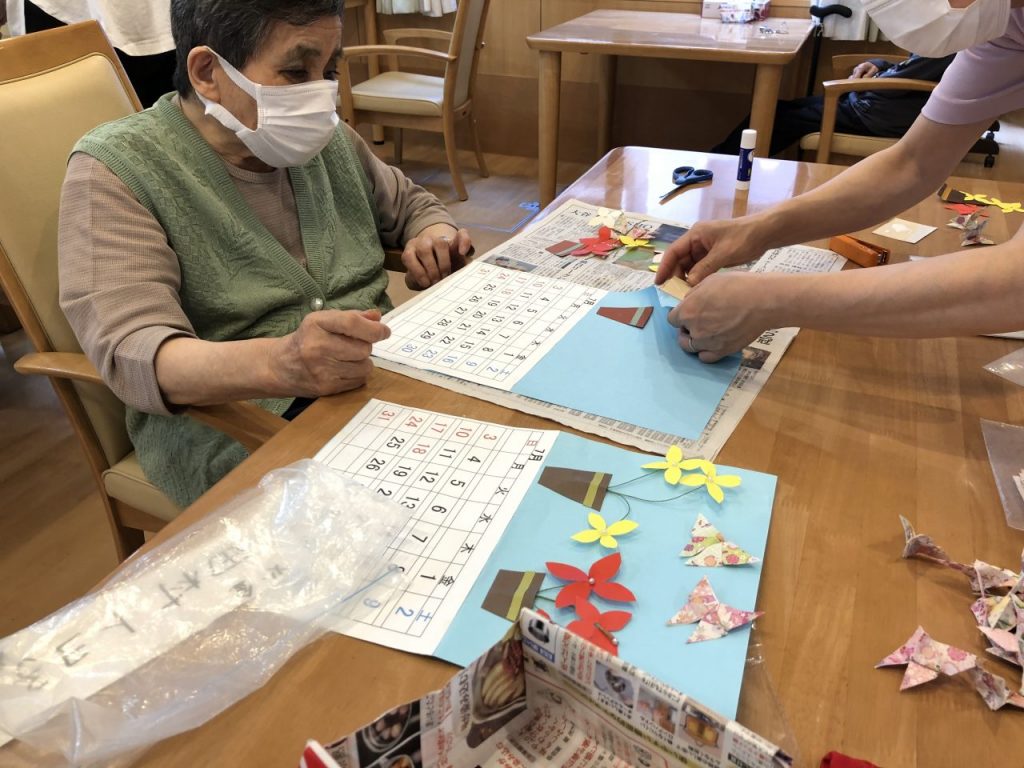 梅花実の名物である、カレンダー作りの様子です。毎月職員がデザインを考えています。有難いことに皆様からご好評をいただいております。
