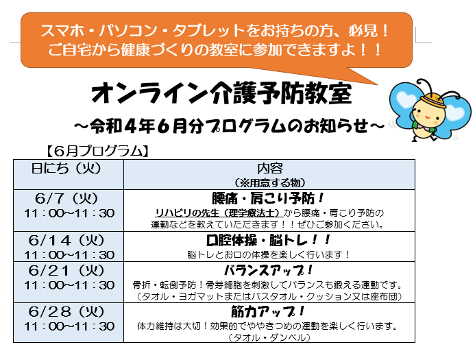 オンライン介護予防教室6月分プログラムのお知らせ!!