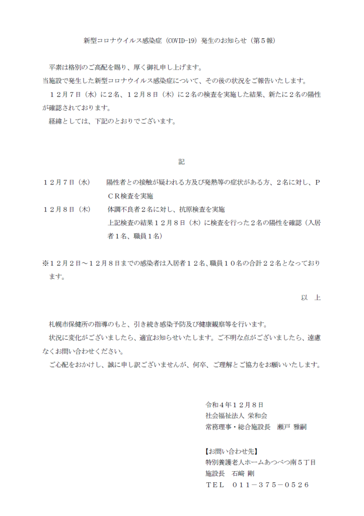 2022.12.08 栄和会全体 コロナウィルス感染症についてのお知らせ 社会福祉法人栄和会 社会福祉法人栄和会からのお知らせです。 新型コロナウィルス感染症についてお知らせ 前の記事 新型コロナウィルス感染症についてお知らせ 次の記事