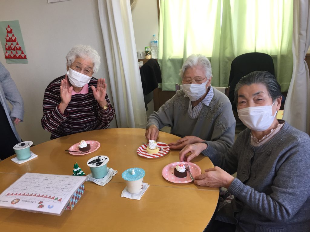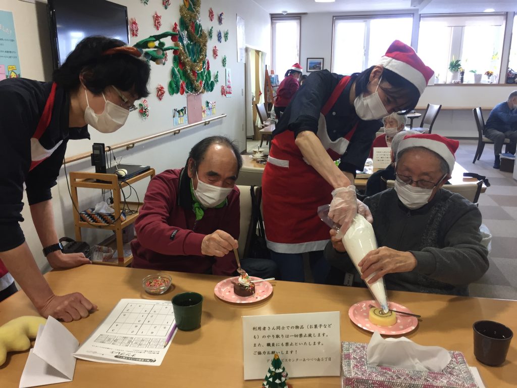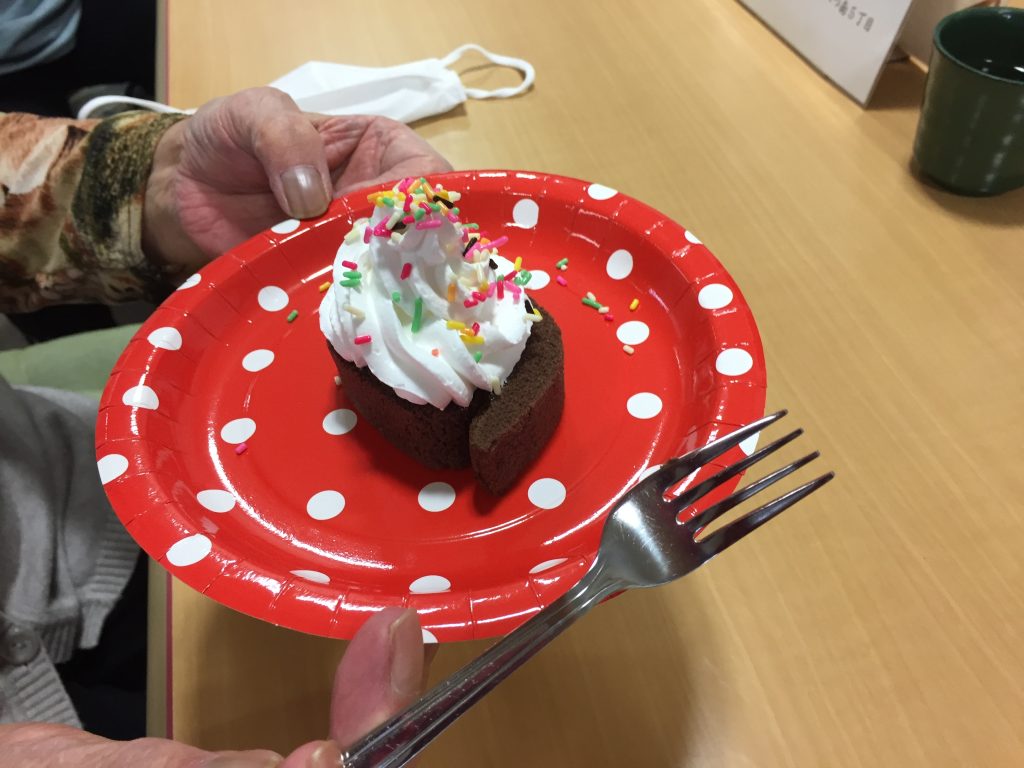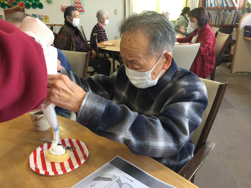 今年はロールケーキにご自身で生クリームとチョコスプレーを好きなだけトッピングしてもらい、クリスマスソングを聞きながらお召し上がりいただきました。