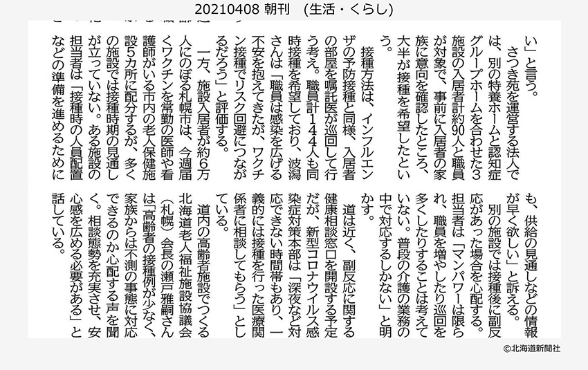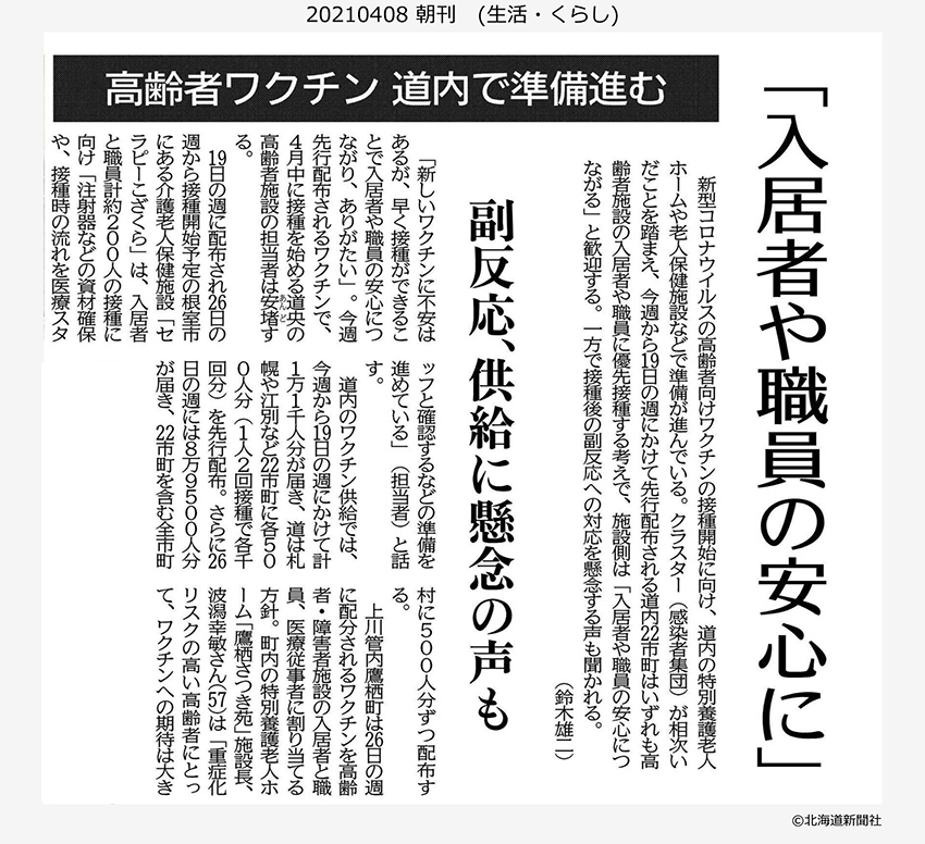 ワクチン接種の準備がすすんでいることが北海道新聞に掲載されました。