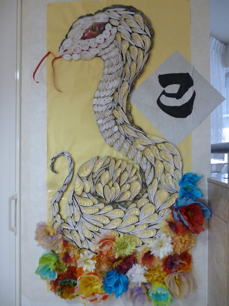 合わせて3か月かけて作成した「ペーパークィリング」の白蛇です。