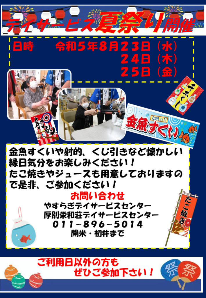 2023.08.05 厚別栄和荘デイサービスセンター 夏祭り開催決定♪ 金魚すくい!くじ引き!射的!などなど たこ焼きやジュースも用意する予定です 今年の暑さを吹き飛ばしましょう♬ やすらぎ 主任カイマイ 厚別区、白石区の一部の方々にデイサービスセンターを楽しくご利用頂けるように、毎日笑顔をモットーにしております! にょろにょろキュウリの漬物♪ 前の記事 ひらおか梅花実 平岡しんたく自治会夏祭り 次の記事