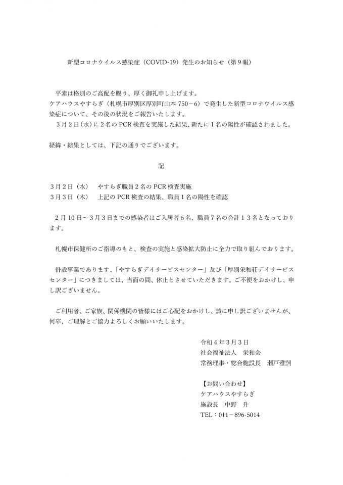 2022.03.03 ケアハウスやすらぎ 新型コロナウイルス感染について お知らせ 栄和会 本部 社会福祉法人栄和会法人本部より大切なお知らせを発信いたします。 福祉職場説明会に参加します 前の記事 新型コロナウイルス感染について お知らせ 次の記事