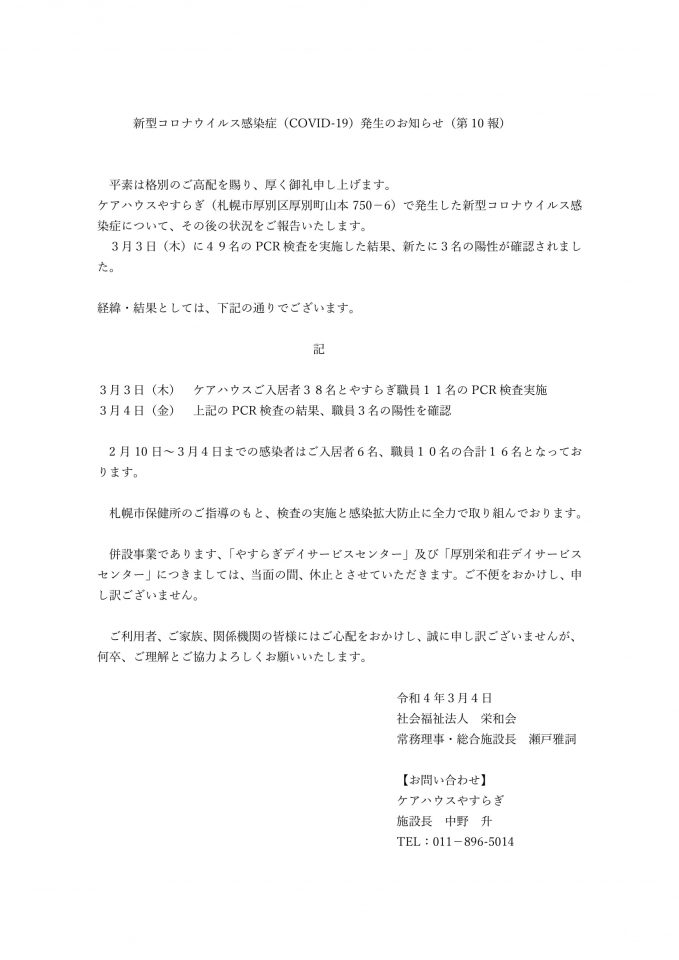 2022.03.04 ケアハウスやすらぎ 新型コロナウイルス感染について お知らせ 栄和会 本部 社会福祉法人栄和会法人本部より大切なお知らせを発信いたします。 新型コロナウイルス感染について お知らせ 前の記事 新型コロナウイルス感染について お知らせ 次の記事