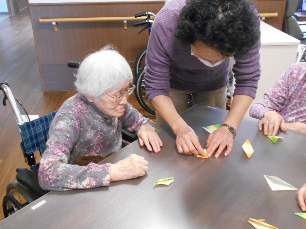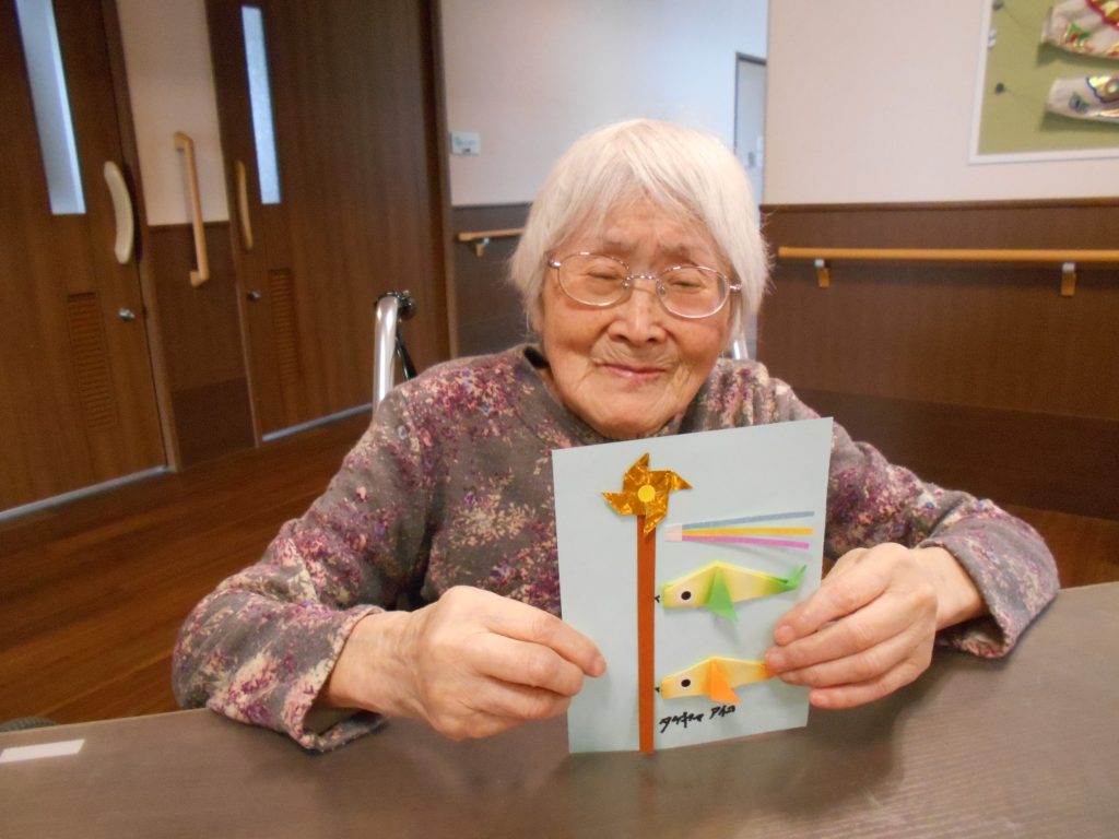 折り紙を使用し、季節の物を案件として活動されているボランティアの方がお越しになり、ご利用者と一緒に鯉のぼりを作成しました。