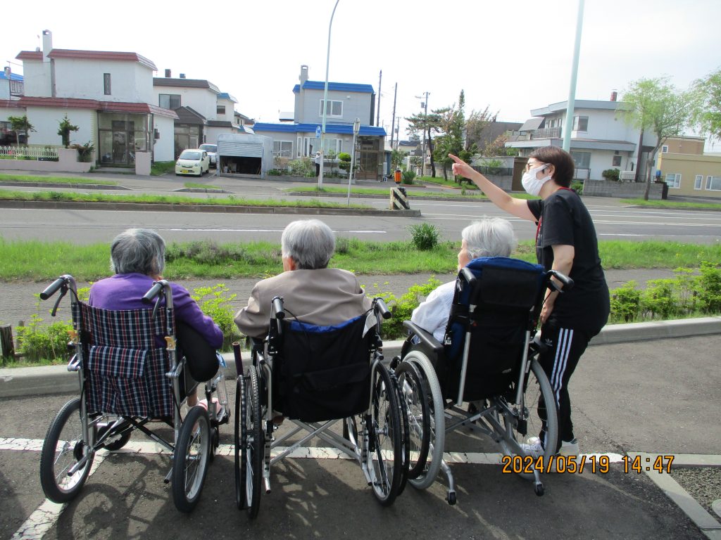 外出の制限がありましたが、ゴールデンウィーク明けより緩和されております。天気の良い日などは気分転換も含めて皆様で外に出ていただき、気温の暑さ、風邪の涼しさなどを感じていただきながら、職員や他ご利用者と交流する機会を設けております。