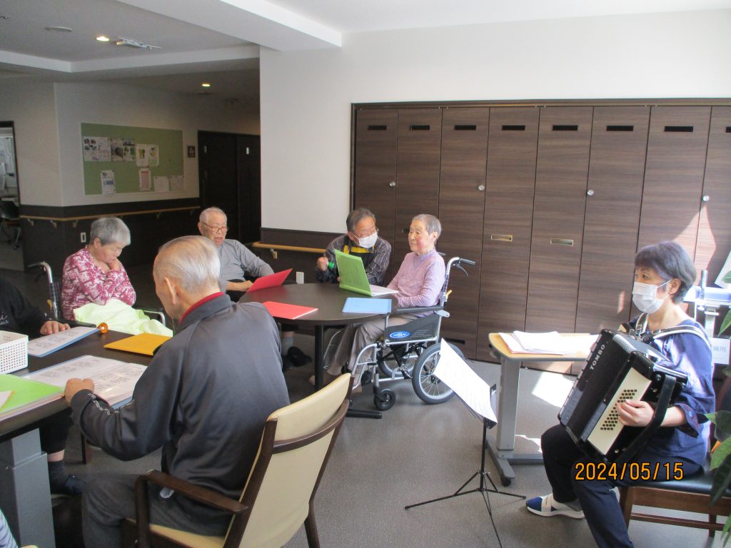 ご利用者の中で歌が好きな方はたくさんいます。ラウンジに集まっていただき、ボランティアの方にも協力、盛り上げていただきながら、職員がアコーディオンを演奏し、楽しく歌う機会がありました。