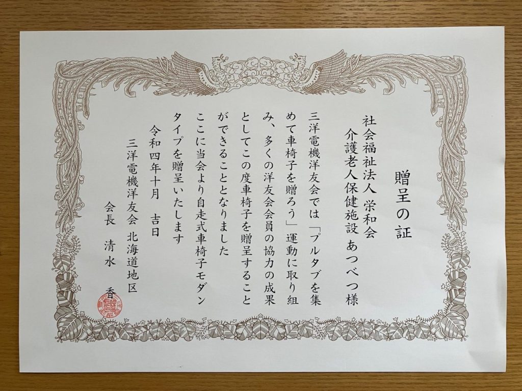 2022.10.05 老人保健施設 あつべつ 車椅子を寄贈していただきました✨ 三洋電機洋友会様より、車椅子を寄贈していただきました(*´ω`*)♿ 立派な車椅子ですね✨10/4に贈呈式を行いました! みなさんで記念撮影 贈呈の証 洋友会様本当にありがとうございました!! 大切に使わせていただきます? すっかり秋ですね・・・? 前の記事 オンライン介護予防教室 令和4年10月のプログラムのお知らせ!! 次の記事