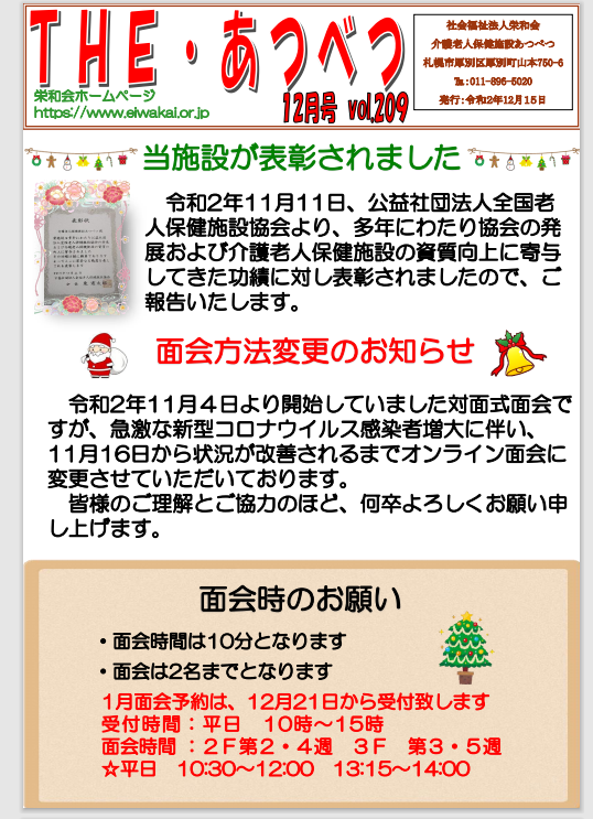 2020.12.24 老人保健施設 あつべつ 12月 機関紙 遅くなりましたが、老健あつべつ12月の機関紙を掲載します☺毎月発行しますのでぜひご覧になってみて下さい☆下のダウンロードをクリックしてみて下さい! 機関紙R2.12月号_vol.209 完成版ダウンロード 社協だよりに掲載されました。 前の記事 冬のスイーツデイ⛄ 次の記事