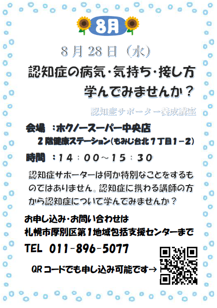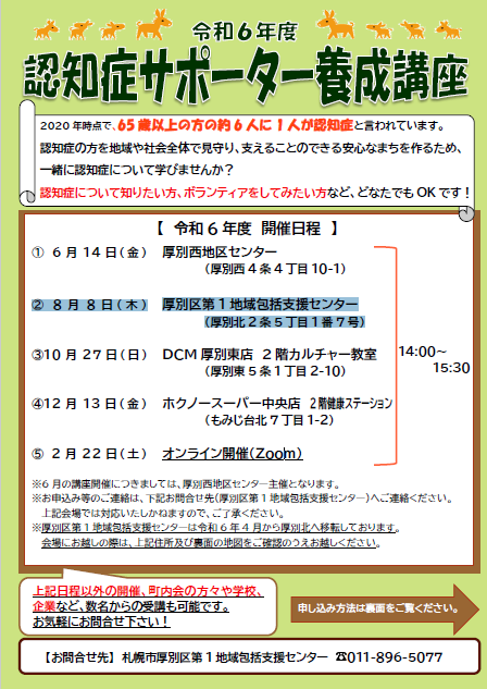 認知症について学びたいと思っている方、今後の生活が不安で勉強したい方、ご家族のために学びたい方、どなたでも構いません!ご興味がありましたら、是非厚別区第1地域包括支援センター(011-896-5077)へご連絡ください!