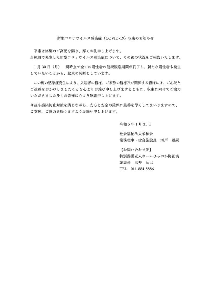 2023.01.31 栄和会全体 新型コロナウイルス感染症の収束のお知らせ 社会福祉法人栄和会 社会福祉法人栄和会からのお知らせです。 ひらおか梅花実デイサービスセンター 毎月恒例「カレンダー作り」 前の記事 ひらおか梅花実デイサービスセンター 花も実もなる通信2月号 次の記事