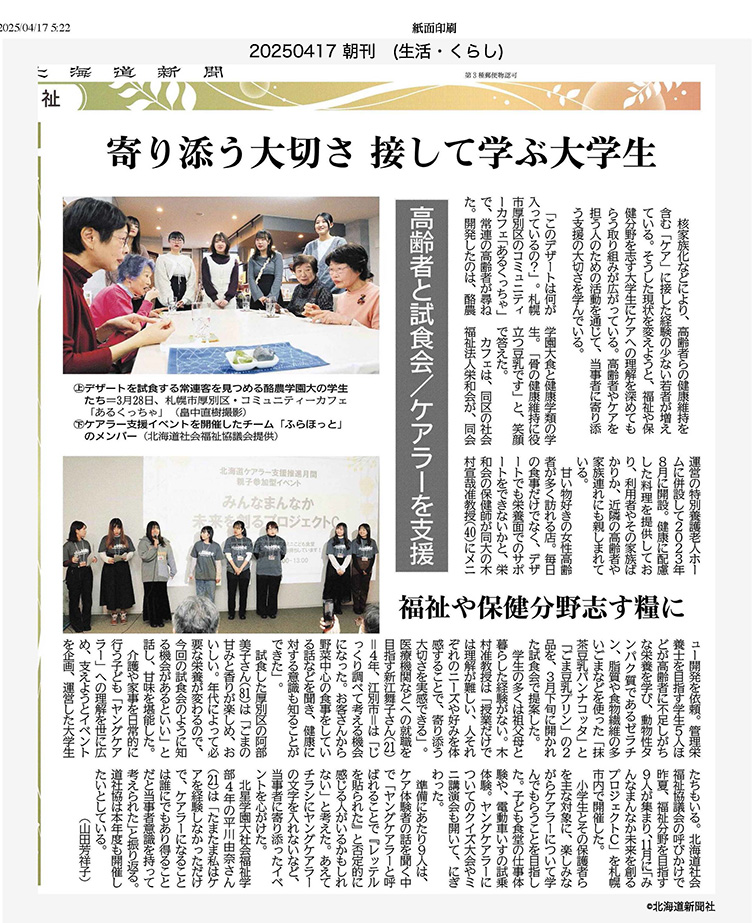 先日、もゆが作る「コミュニティカフェ あるくっちゃ」で開催した試食会の様子が、北海道新聞に掲載されました(*^^*)
