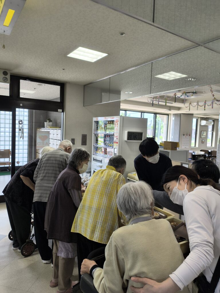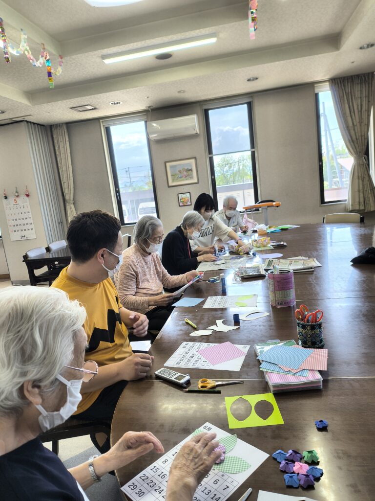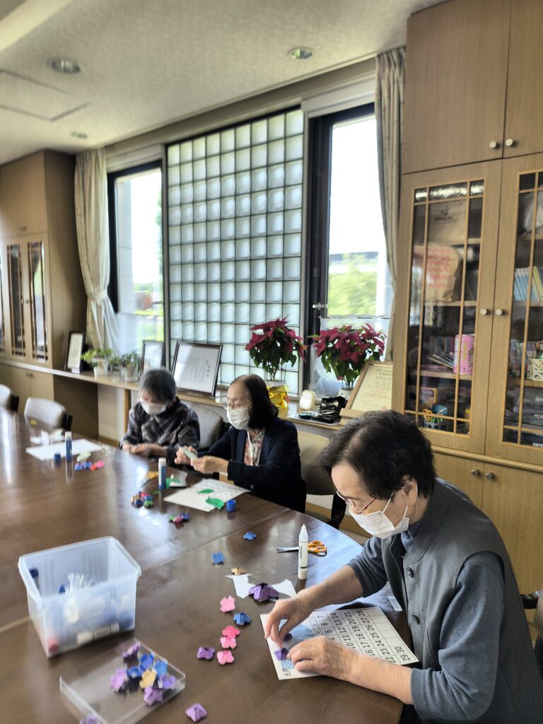 レクで来月のカレンダー作りをしました。皆さん様々なアジサイを折り紙で作って貼っています。そんな最中に・・・