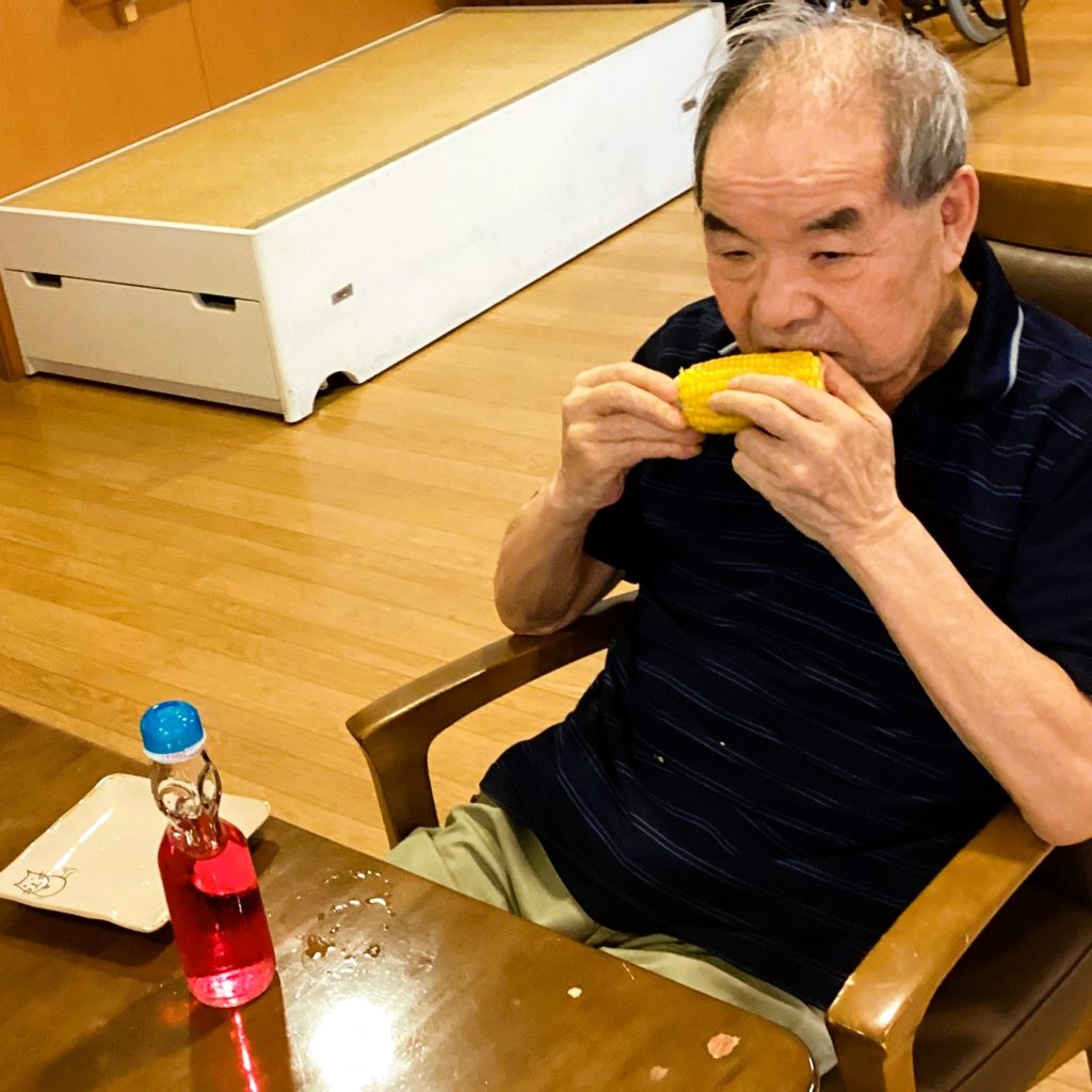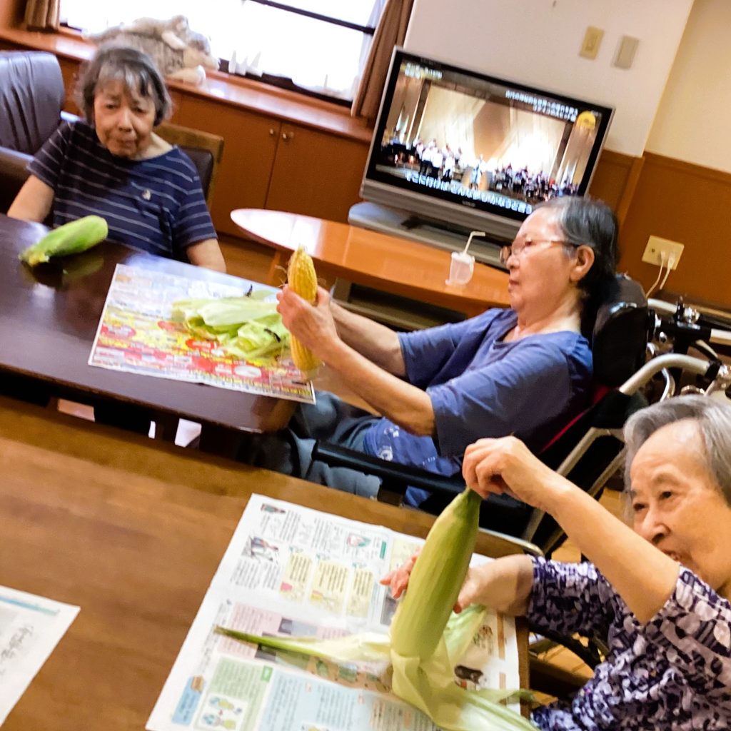 皮付きのとうきびを買ってきて、皆さんにむいていただきました。この作業があると、余計においしく感じます。