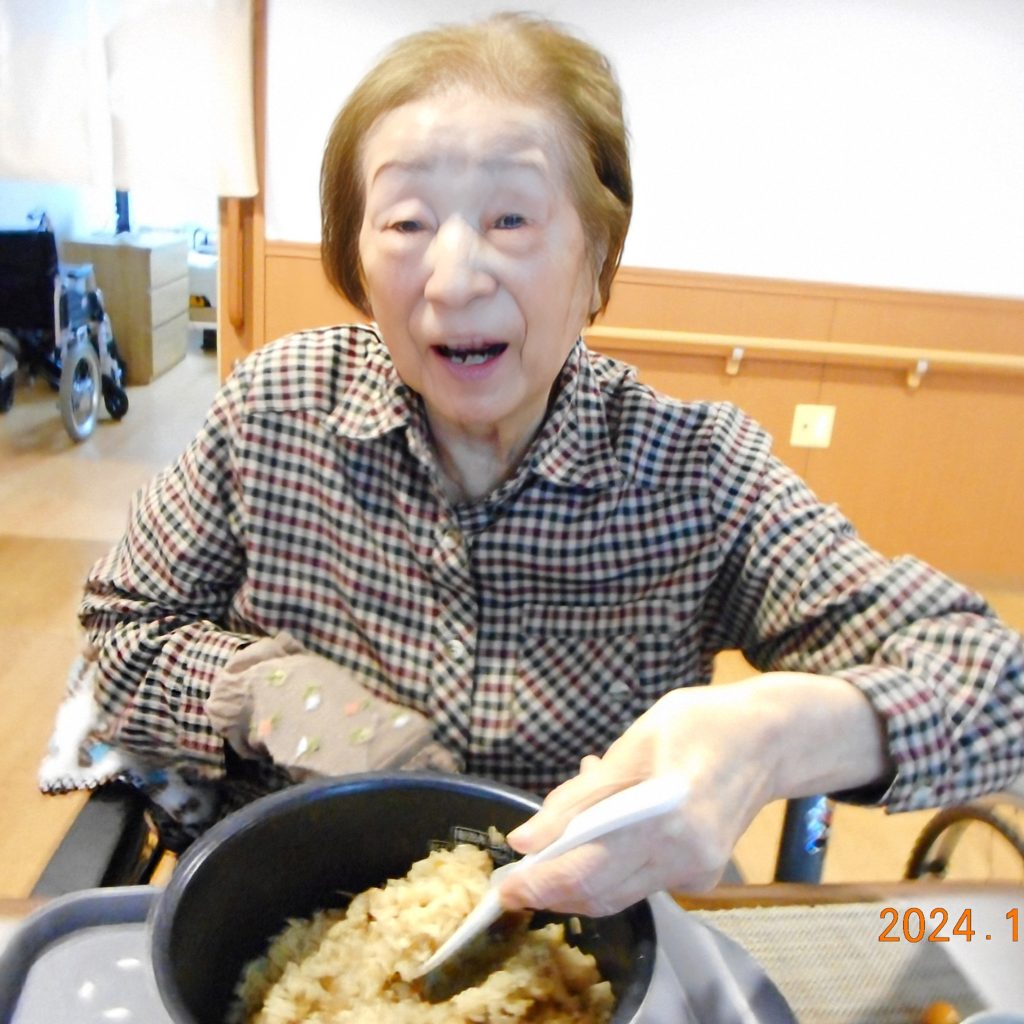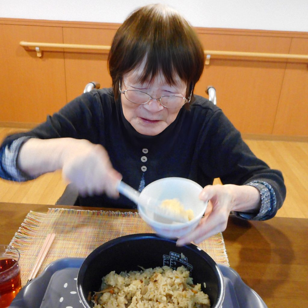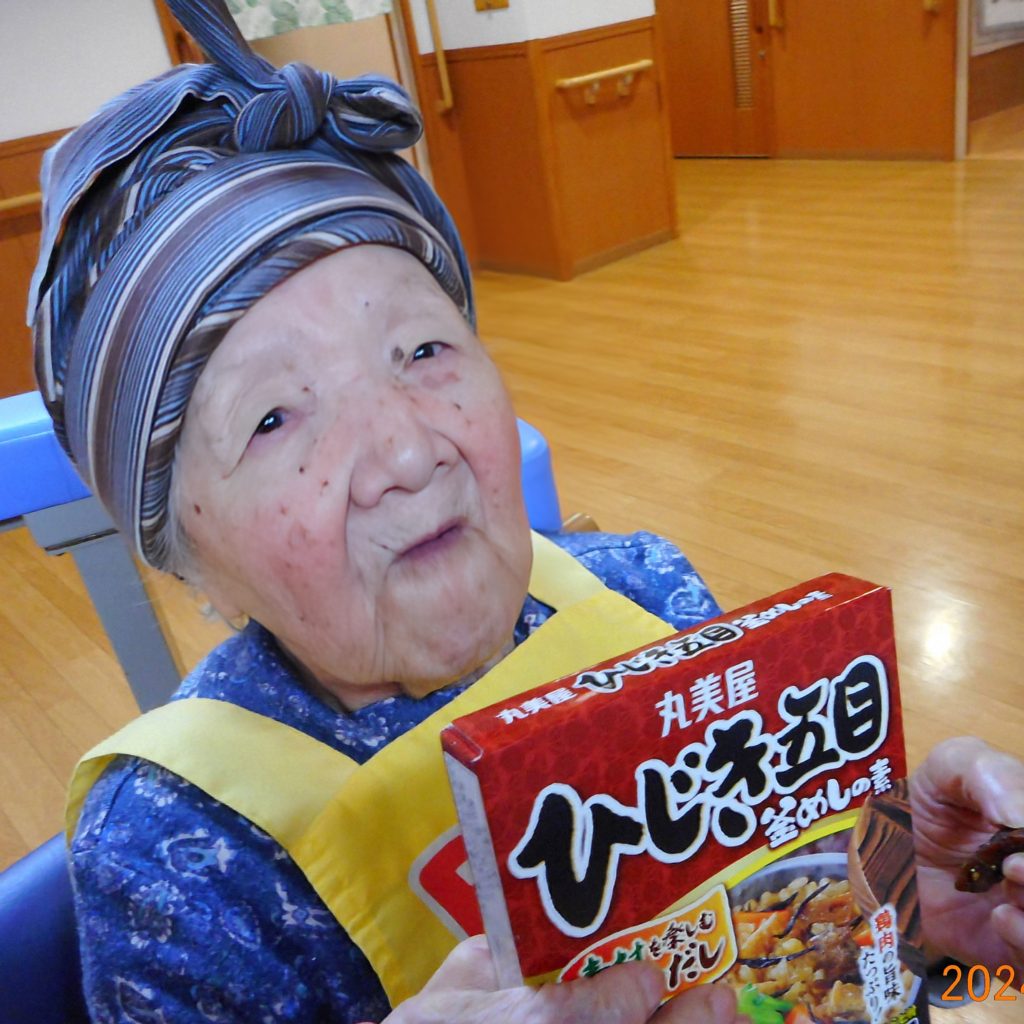 今日の昼食はひじき五目ごはんです。最初から正直に打ち明けます。炊き込みご飯の素を使いました。でもおいしくて、皆さんで盛り上がります。とってもおすすめです。