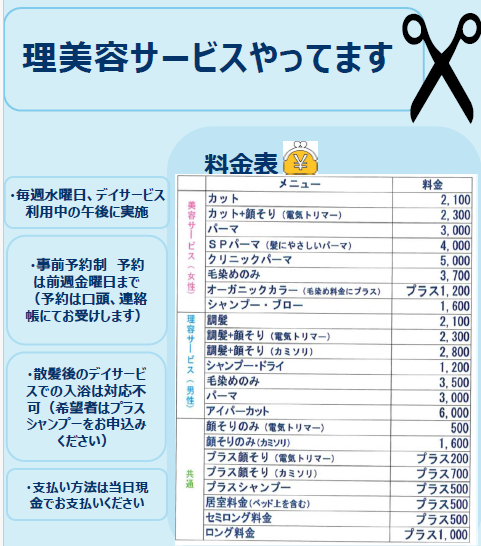 そしてご希望の多かった「理美容」。ついに1月より開始しました。毎週水曜日に行っていますが、毎週ご予約をいただいております。料金表を添付しますので、ご参考までに。用紙でもお渡しできますので、お声掛けください。