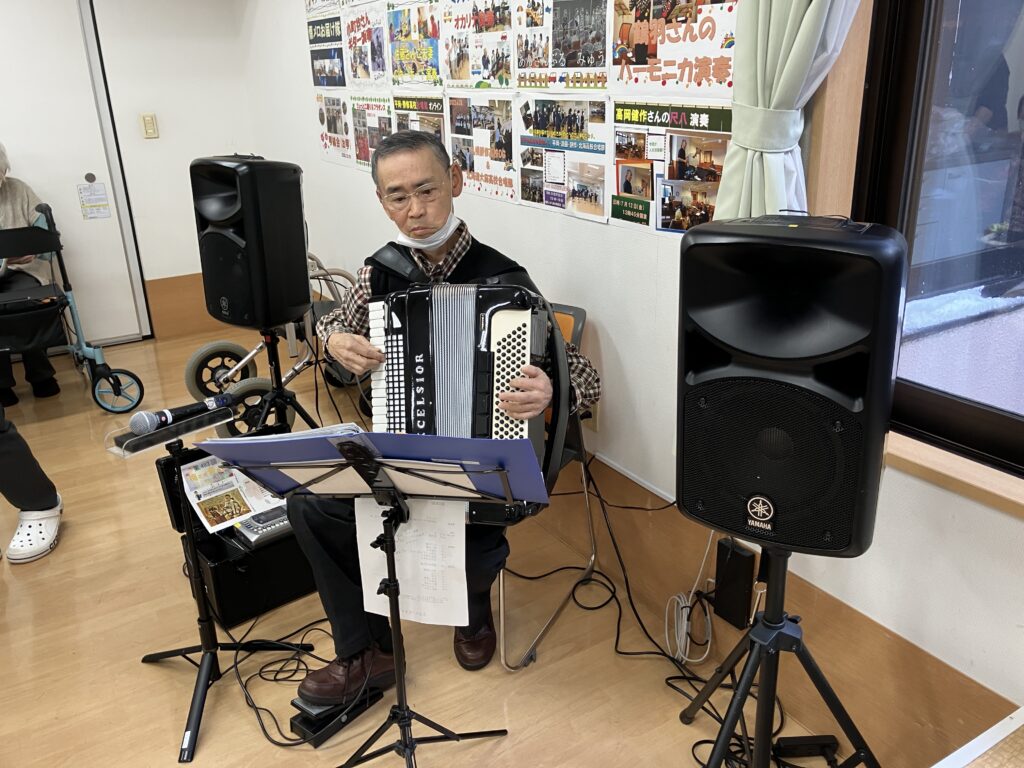 梅音も毎月行っています。今月は尺八にハーモニカ、アコーディオン。毎月3回ほど行っています。