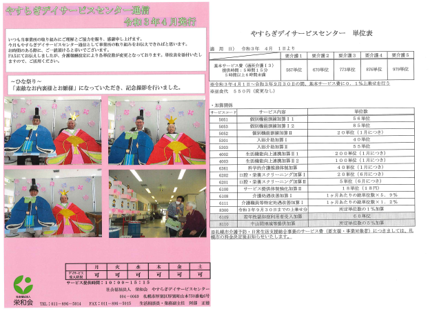 やすらぎデイサービスセンター通信4月号が完成しました。