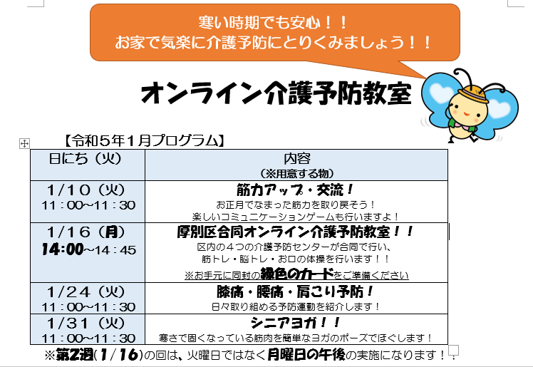 ご興味のある方は、お気軽に介護予防センター厚別西東(℡:011-896-5019)までご連絡ください。