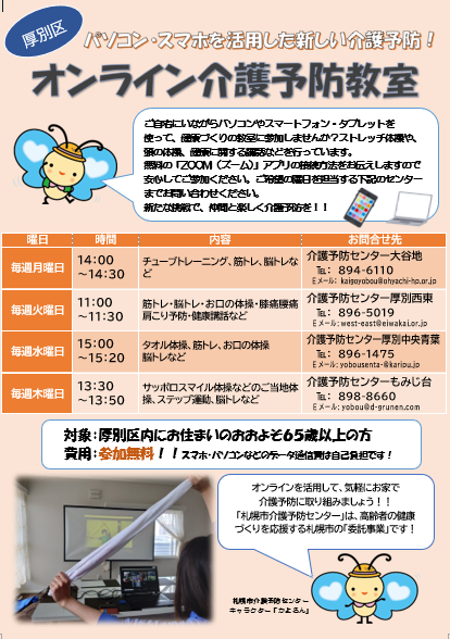 介護予防センター厚別西東が実施しておりますオンライン介護予防教室の5月分のプログラムをお知らせいたします。