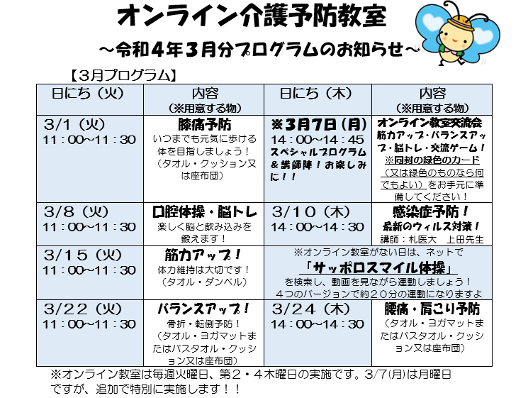 オンライン介護予防教室3月分プログラムのお知らせ!!