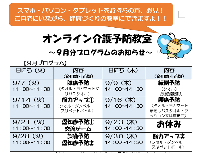 オンライン介護予防教室9月分プログラム等のお知らせ