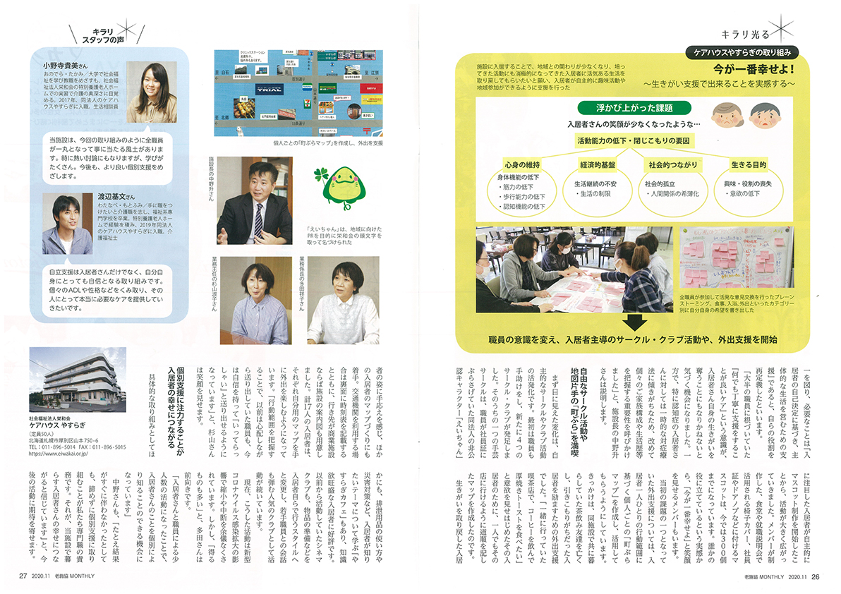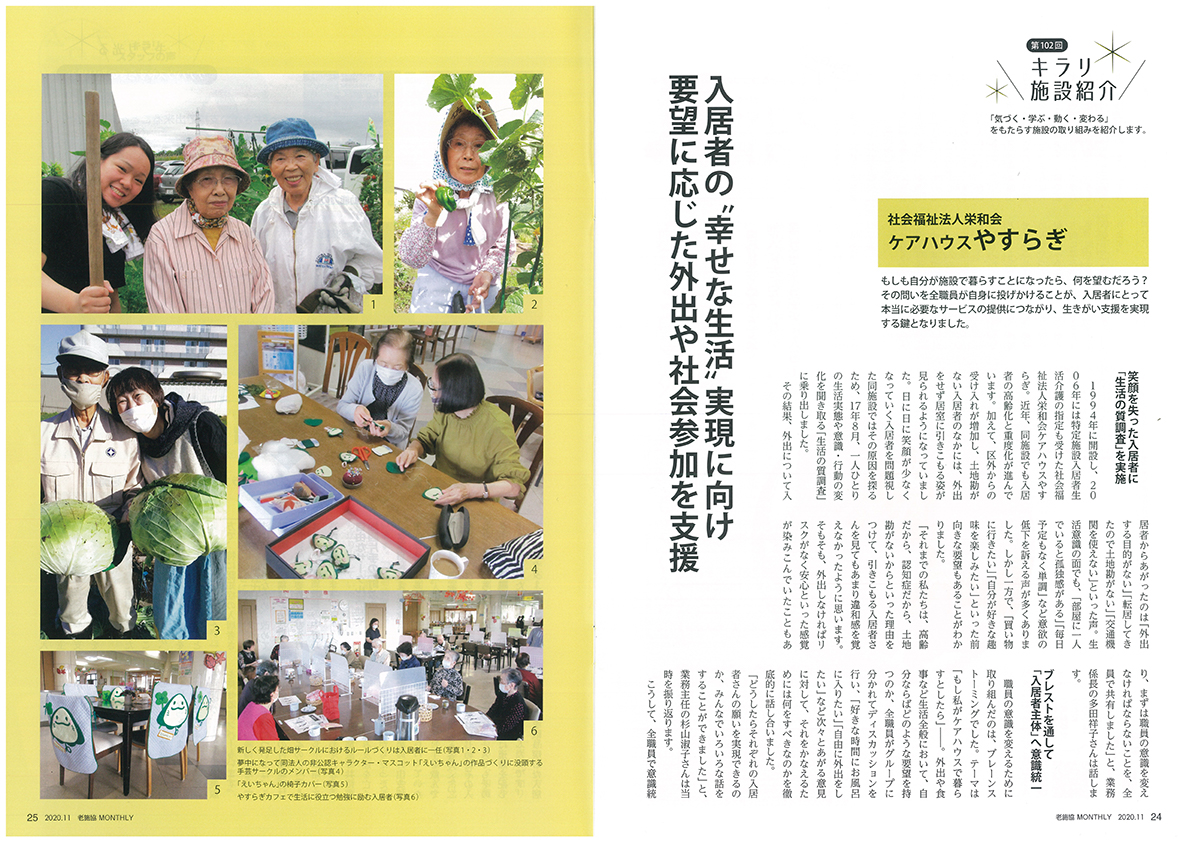 2020.12.02 ケアハウスやすらぎ キラリ☆施設紹介 えいちゃん月間老施協11月号(全国老人福祉施設協議会広報誌)のキラリ施設紹介で、ケアハウスやすらぎが紹介されました!!画像をクリックするとPDFで開きます。じっくりご覧くださいませ~~~キラリ☆ えいちゃん 社会福祉法人栄和会のマスコットキャラクターの「えいちゃん」です。 栄和会の出来事をそっと覗いているんだ。どこにでも出没するよ。 面白いことや楽しいことが大好き!!! それとね、栄和会には映えるスポットがあるんだよ。探してみてね☆ X YouTube 初任者研修開講 前の記事 新型コロナウイルス感染症発生のお知らせ 次の記事