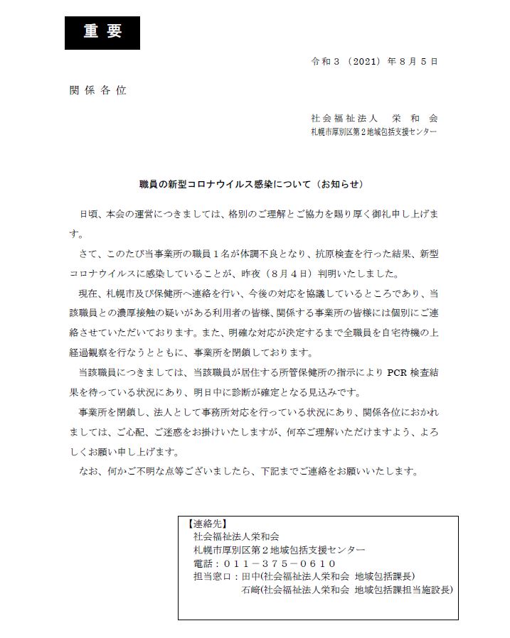2021.08.05 札幌市厚別区第2地域包括支援センター コロナウィルス感染についてお知らせ 画像をクリックで、PDFが開きます。 栄和会 本部 社会福祉法人栄和会法人本部より大切なお知らせを発信いたします。 オンライン介護予防教室8月分プログラムのお知らせ! 前の記事 令和3年8月5日 厚別栄和荘2階 野外昼食会 次の記事