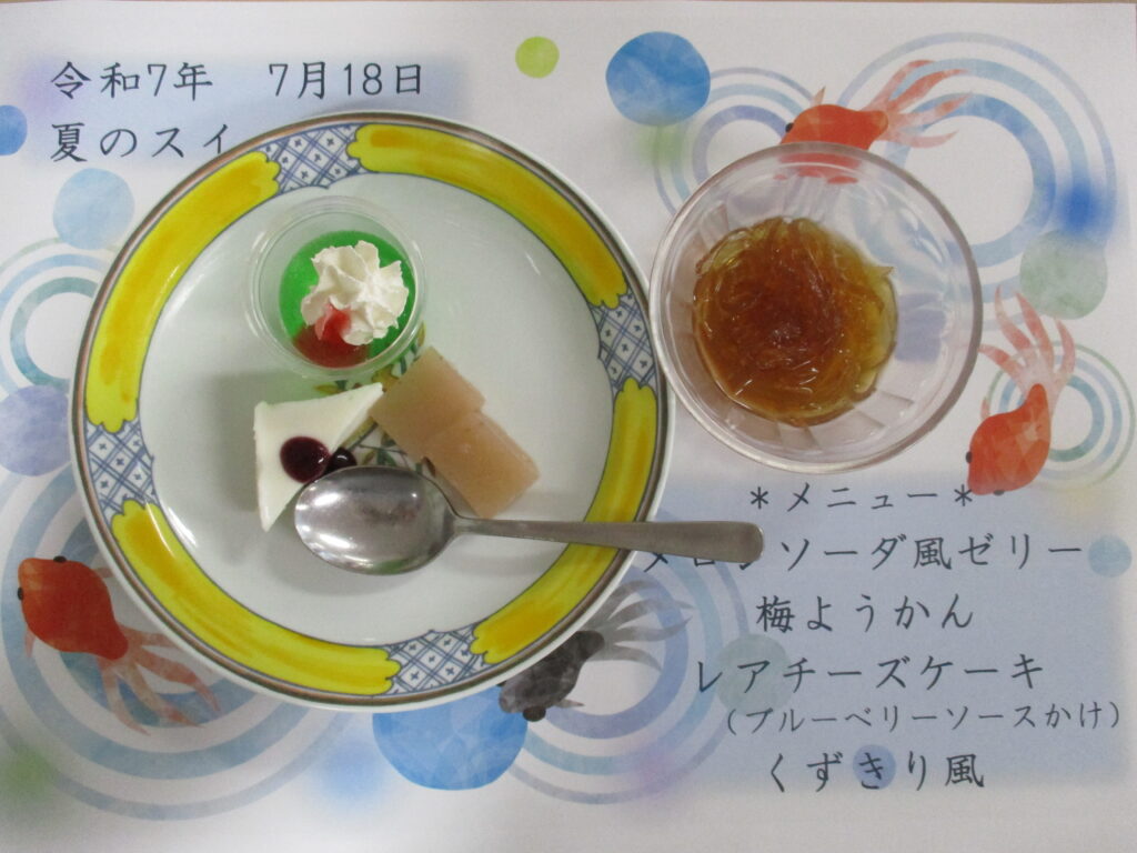 メロンソーダ風ゼリー/梅ようかん/レアチーズケーキ ブルーベリーソースがけ/くずきり風 黒蜜がけ