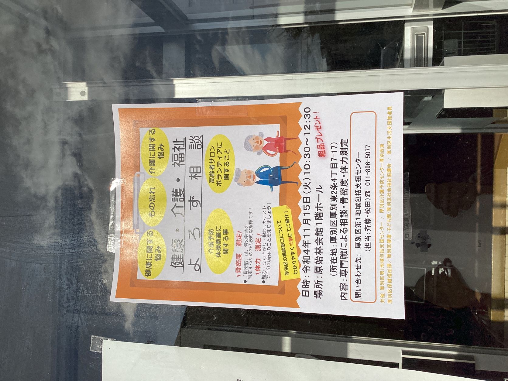 11月15日(火)原始林会館1階ホールにて老人クラブ高杉会の例会後に、厚別区第1地域包括支援センター、厚別区介護予防センター厚別西東、厚別区保健福祉課・厚別区健康子ども課、厚別区社会福祉協議会、厚別区生活支援推進員との協働で相談会を開催しました!
