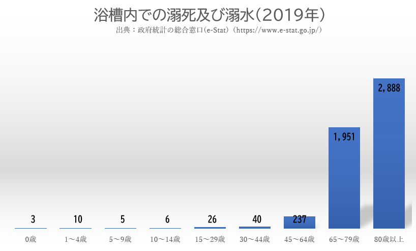 人口動態統計による家庭の浴槽での溺死者数は、2019年に5166件おきており、そのうちの9割以上が65歳以上の高齢者となっています。