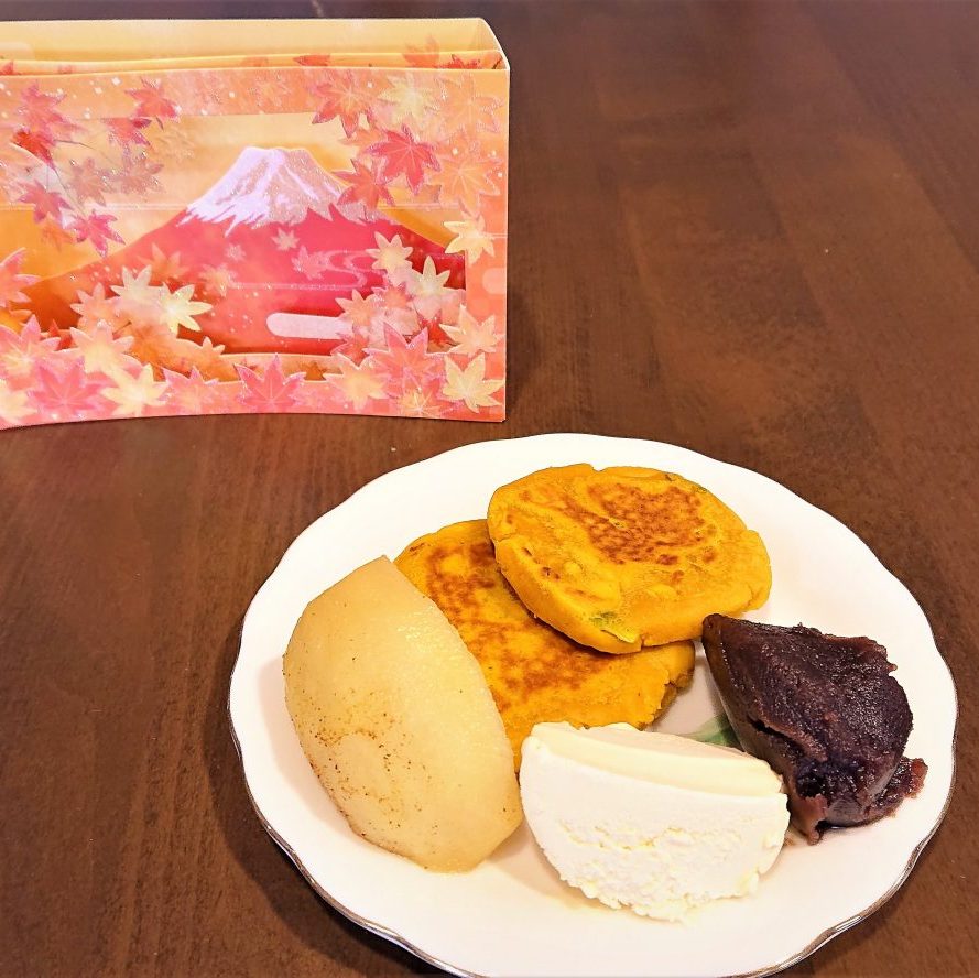 南瓜団子にアイス・あんこ・リンゴのコンポートを盛り合わせた食べ応えのあるおやつになりました。