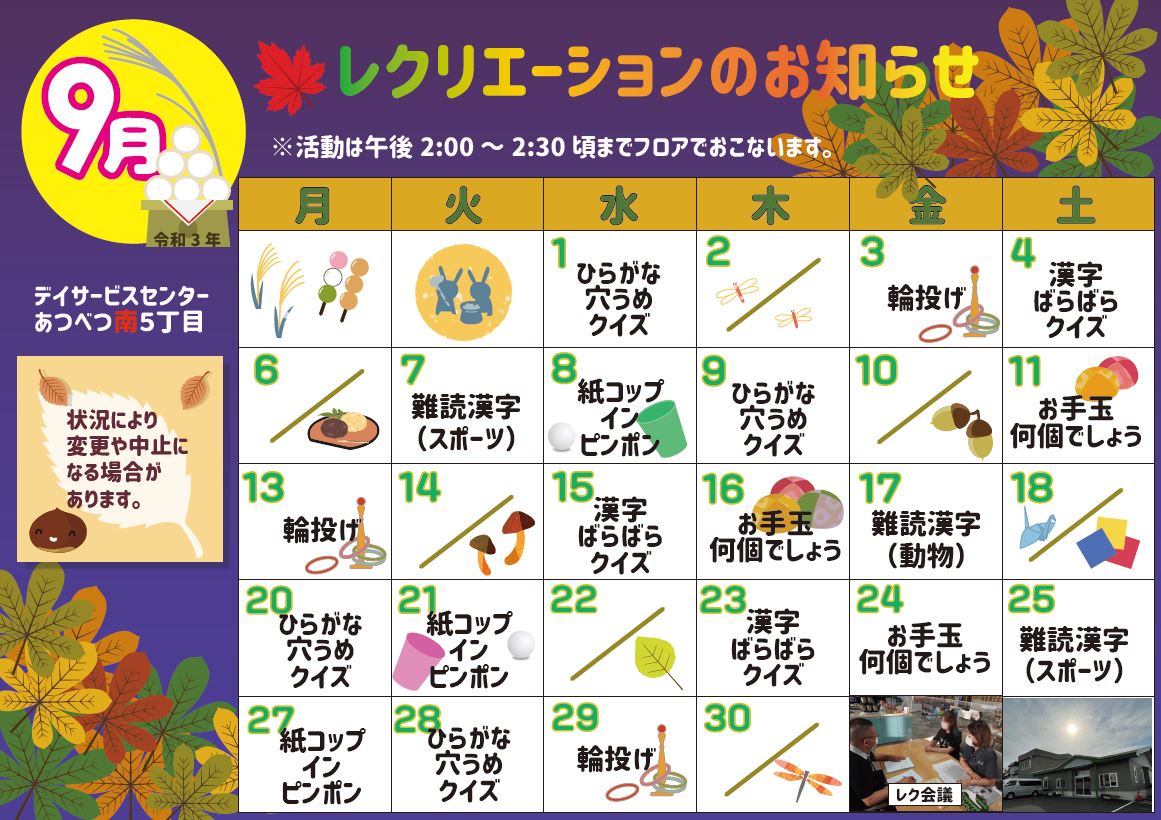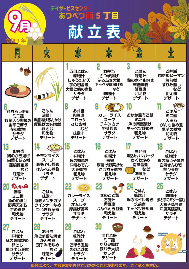 2021.08.30 デイサービスセンター あつべつ南5丁目 南5丁目デイサービス 9月のレクリエーションと献立 9月のレクリエーションと献立一覧ができましたー!9月も元気に楽しく過ごしましょう! 南5丁目デイ 係長コザイ デイサービスの各行事や何気ない日常の様子など発信していきます。 あつべつデイケア「夏祭り」開催 前の記事 地域の方の手作りほっターが届きました♡ 次の記事