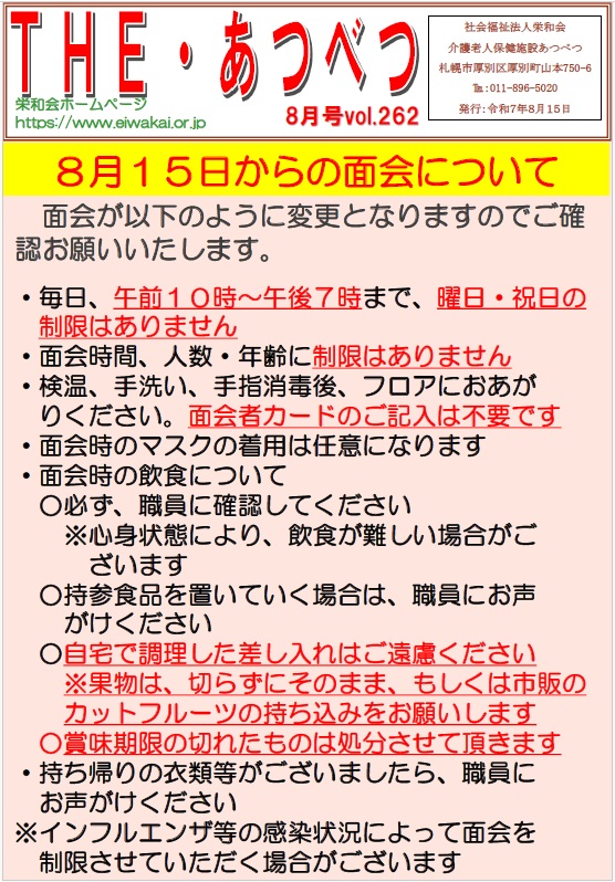 本号では、「8月15日からの面会に関するご案内」と「夏のスイーツデイの様子」を掲載しております。