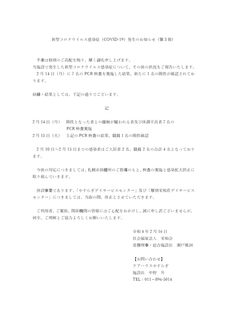 2022.02.16 ケアハウスやすらぎ 新型コロナウイルス感染について お知らせ 栄和会 本部 社会福祉法人栄和会法人本部より大切なお知らせを発信いたします。 新型コロナウイルス感染について お知らせ 前の記事 新型コロナウイルス感染について お知らせ 次の記事