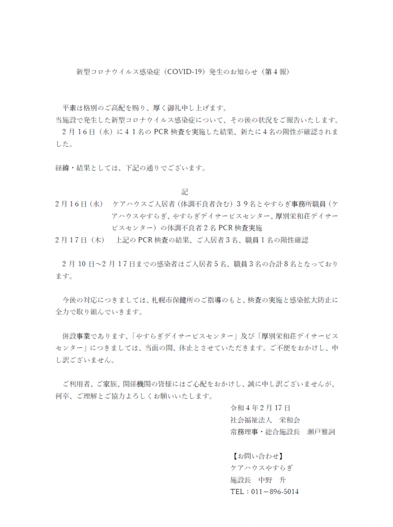 2022.02.17 ケアハウスやすらぎ 新型コロナウイルス感染について お知らせ 栄和会 本部 社会福祉法人栄和会法人本部より大切なお知らせを発信いたします。 新型コロナウイルス感染について お知らせ 前の記事 新型コロナウイルス感染について お知らせ 次の記事