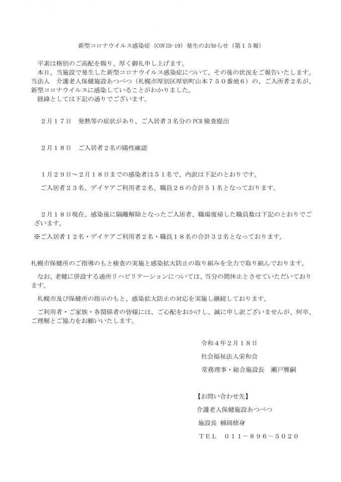 2022.02.18 老人保健施設 あつべつ 新型コロナウイルス感染について お知らせ 栄和会 本部 社会福祉法人栄和会法人本部より大切なお知らせを発信いたします。 新型コロナウイルス感染について お知らせ 前の記事 新型コロナウイルス感染について お知らせ 次の記事