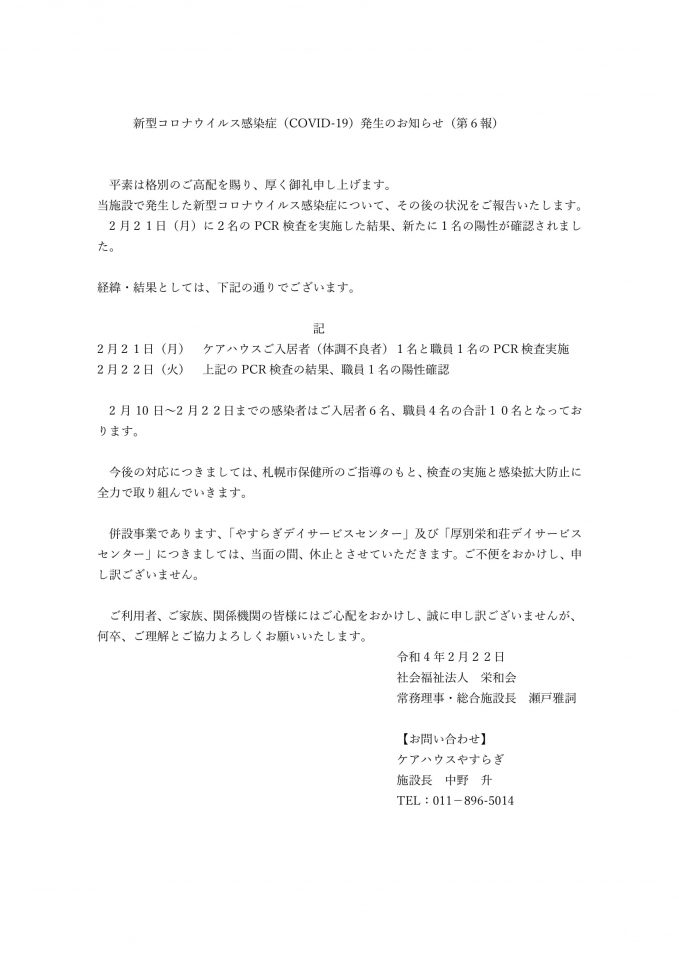 2022.02.22 ケアハウスやすらぎ 新型コロナウイルス感染について お知らせ 栄和会 本部 社会福祉法人栄和会法人本部より大切なお知らせを発信いたします。 新コロナウイルス感染について お知らせ 前の記事 新型コロナウイルス感染について お知らせ 次の記事