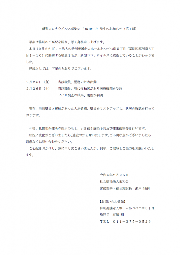 2022.02.26 特別養護老人ホーム あつべつ南5丁目 新型コロナウイルス感染について お知らせ 栄和会 本部 社会福祉法人栄和会法人本部より大切なお知らせを発信いたします。 新型コロナウイルス感染について お知らせ 前の記事 オンライン介護予防教室3月分プログラムのお知らせ!! 次の記事