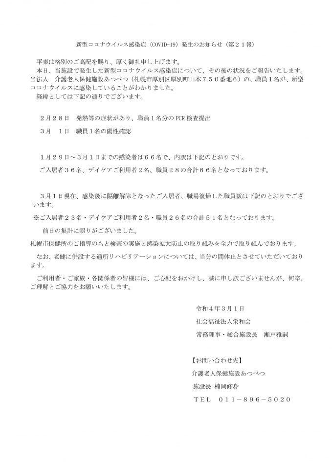 2022.03.01 老人保健施設 あつべつ 新型コロナウイルス感染について お知らせ 栄和会 本部 社会福祉法人栄和会法人本部より大切なお知らせを発信いたします。 新型コロナウイルス感染について お知らせ 前の記事 新型コロナウイルス感染について お知らせ 次の記事