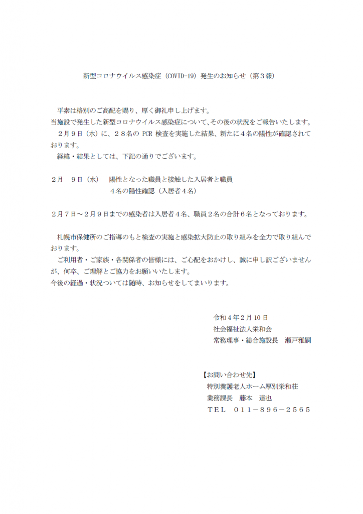 2022.02.10 特別養護老人ホーム 厚別栄和荘 新型コロナウイルス感染について お知らせ 栄和会 本部 社会福祉法人栄和会法人本部より大切なお知らせを発信いたします。 ひらおか梅花実デイサービスセンター ”準備は着々と” 前の記事 新型コロナウイルス感染について お知らせ 次の記事