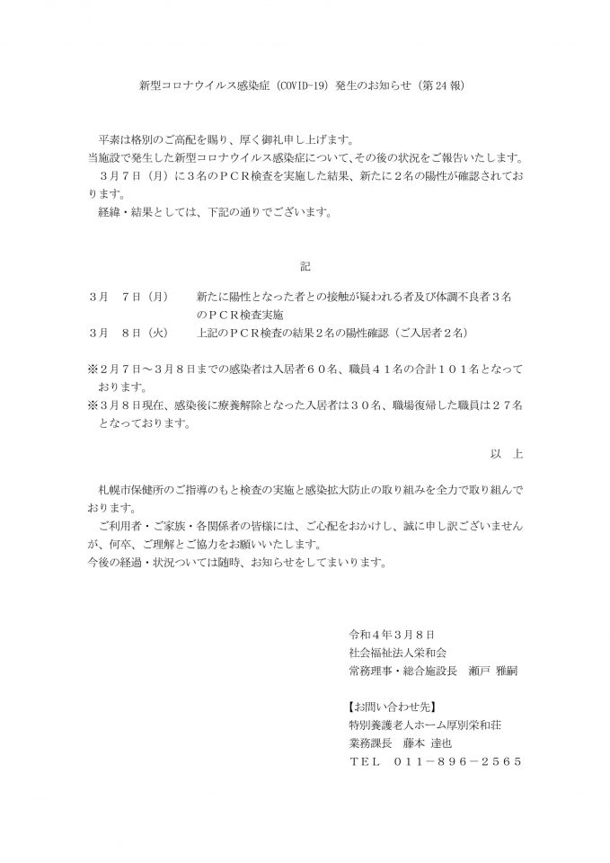 2022.03.08 特別養護老人ホーム 厚別栄和荘 新型コロナウイルス感染について お知らせ 栄和会 本部 社会福祉法人栄和会法人本部より大切なお知らせを発信いたします。 新型コロナウイルス感染について お知らせ 前の記事 新型コロナウイルス感染 終息のお知らせ 次の記事