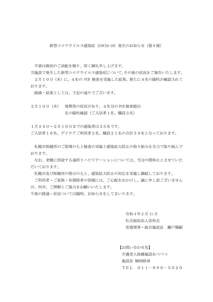 2022.02.11 老人保健施設 あつべつ 新型コロナウイルス感染について お知らせ 栄和会 本部 社会福祉法人栄和会法人本部より大切なお知らせを発信いたします。 新型コロナウイルス感染について お知らせ 前の記事 新型コロナウイルス感染について お知らせ 次の記事