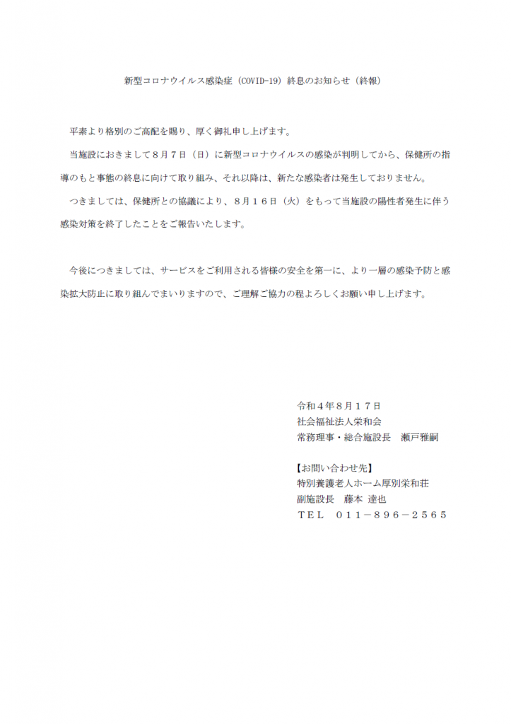 2022.08.17 特別養護老人ホーム 厚別栄和荘 新型コロナウイルス感染症についてお知らせ 栄和会 本部 社会福祉法人栄和会法人本部より大切なお知らせを発信いたします。 デイサービスセンターあつべつ南5丁目~2人目の達成者!!~ 前の記事 ひらおか梅花実デイサービスセンター スイカ割り! 次の記事