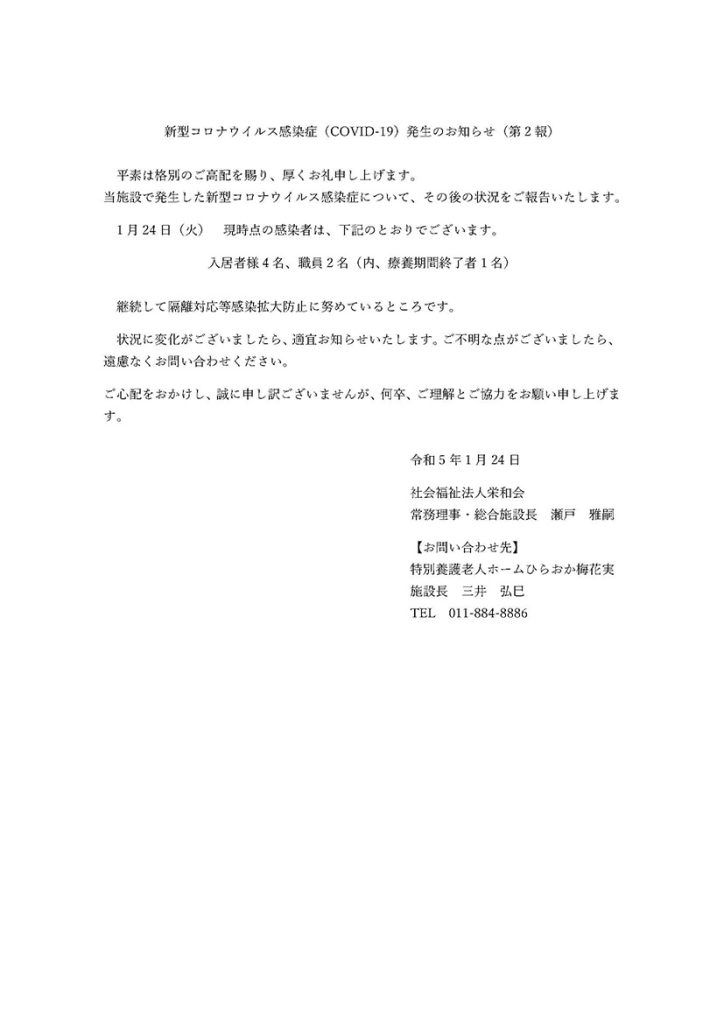 2023.01.24 栄和会全体 新型コロナウイルス感染症についてお知らせ 社会福祉法人栄和会 社会福祉法人栄和会からのお知らせです。 介護予防教室に参加しませんか? 前の記事 オンライン介護予防教室 令和5年2月分プログラムのお知らせ!! 次の記事