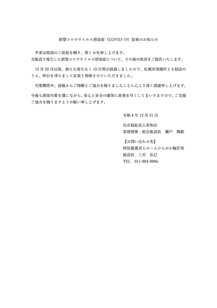 2022.12.31 栄和会全体 新型コロナウイルス感染症の収束のお知らせ 社会福祉法人栄和会 社会福祉法人栄和会からのお知らせです。 新型コロナウイルス感染症についてお知らせ 前の記事 ひらおか梅花実デイサービスセンター 新年のご挨拶 次の記事